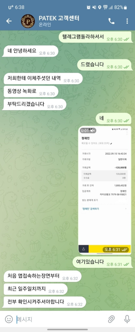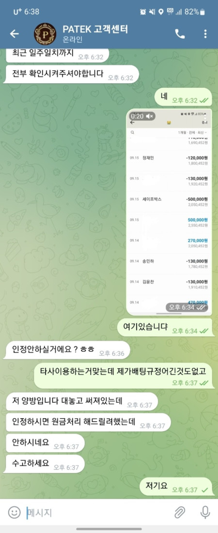 파텍 이용하다가 12충 49환 롤링700%정도 돌렸는데 텔레그램달래서 주니깐 이체내역부터 하란거다했더니 저거 할말만하고 차단해버리네요 파텍 개씹먹싸 이용중지하세요~